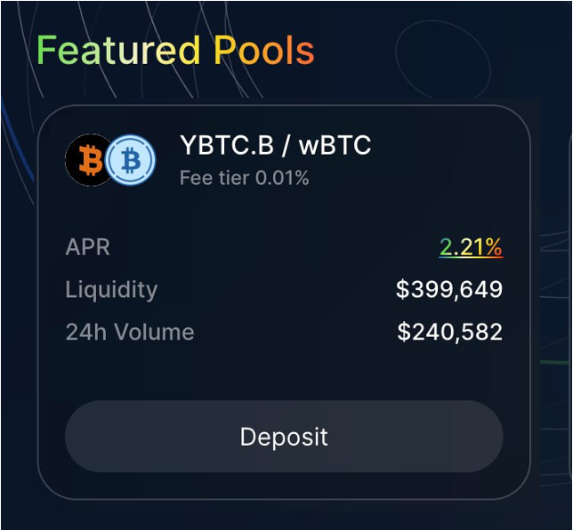 • YBTC.B Liquidity Boost on Sui Network: The YBTC.B/wBTC pair was prominently featured on Turbos Finance’s Featured Pools, offering ~2.24% APR with approximately $394K in liquidity and $240K in 24-hour trading volume. This integration supports secure liquidity provision and rewards for BTC holders participating in programmable yields.